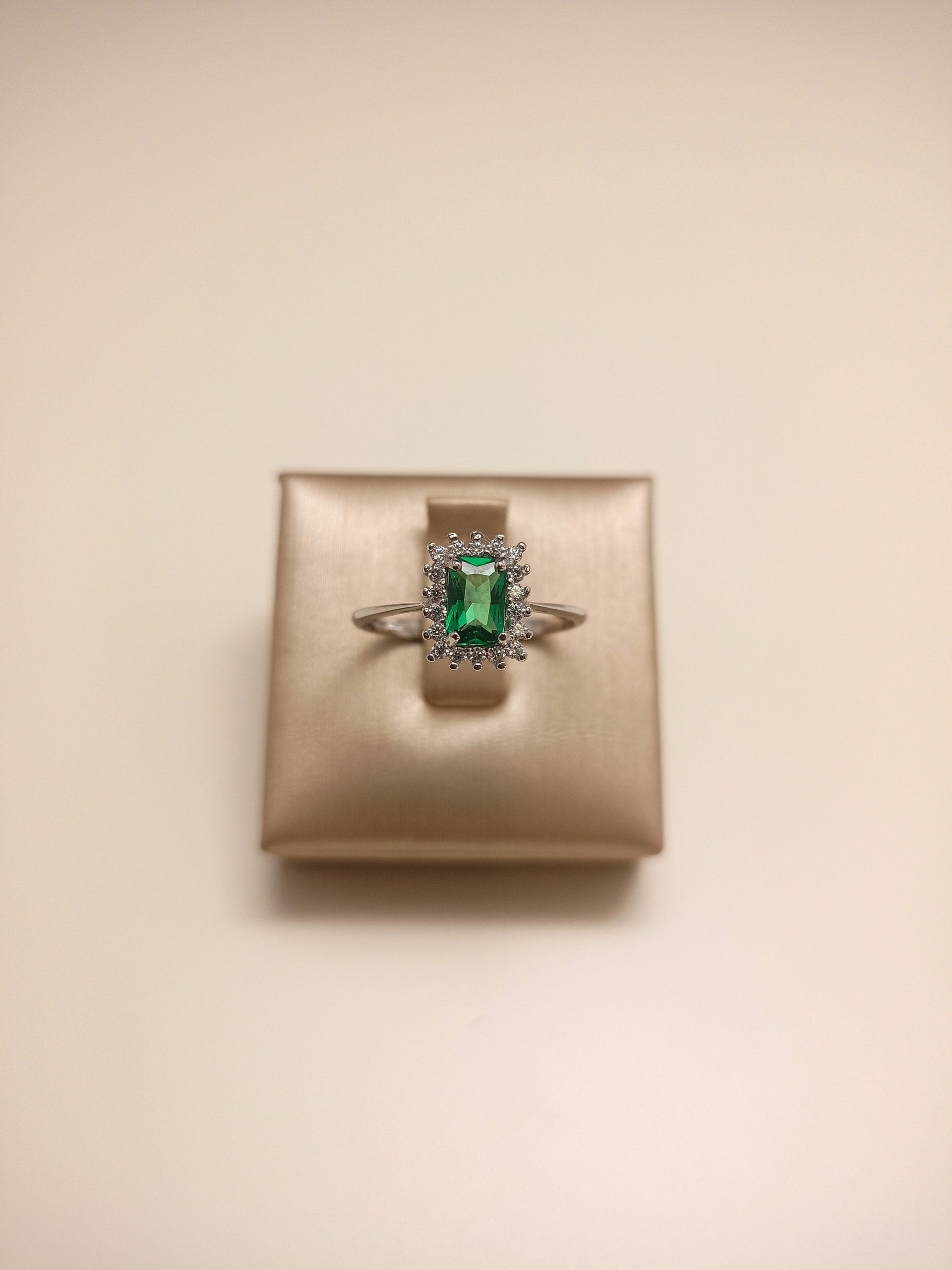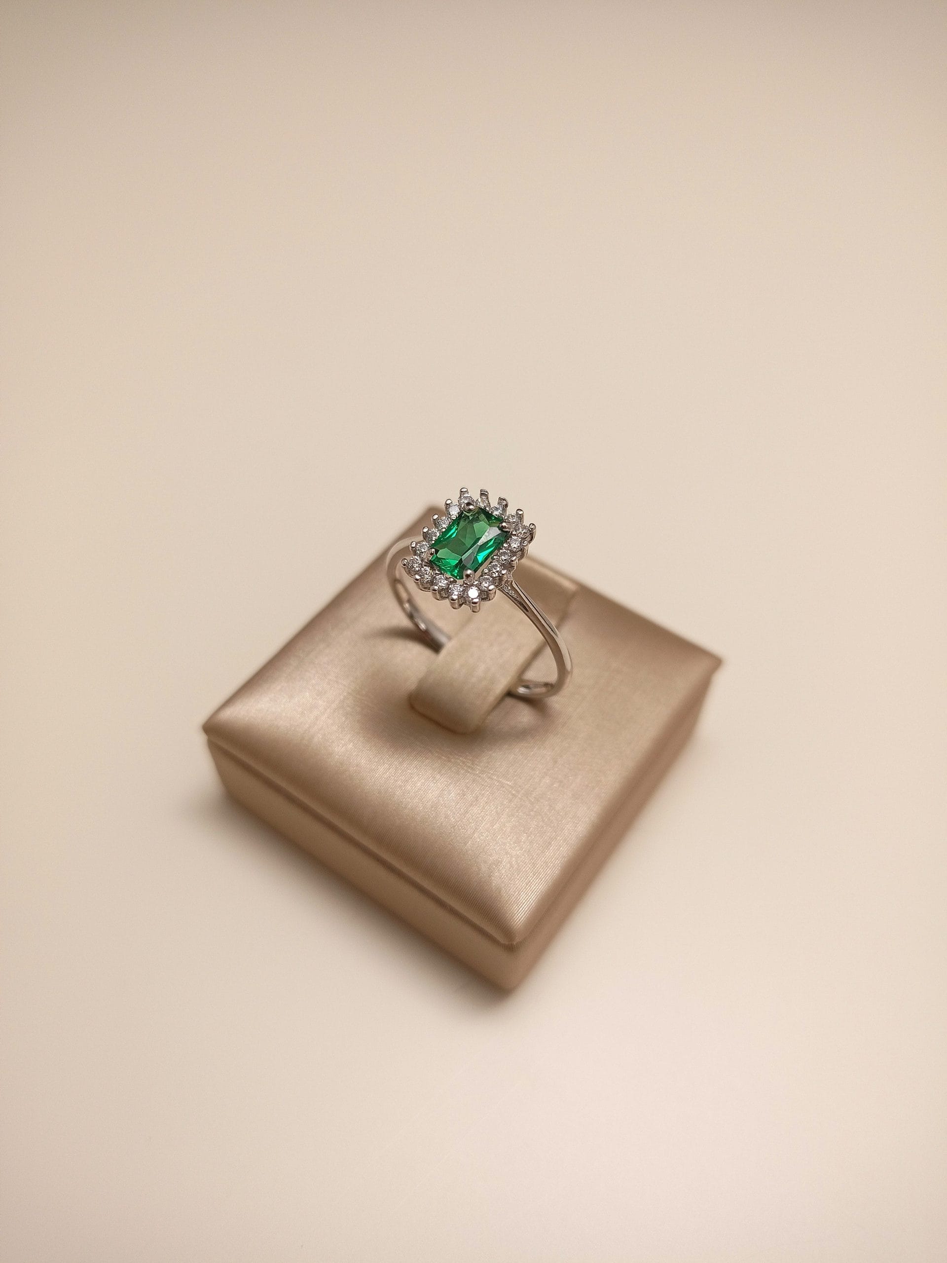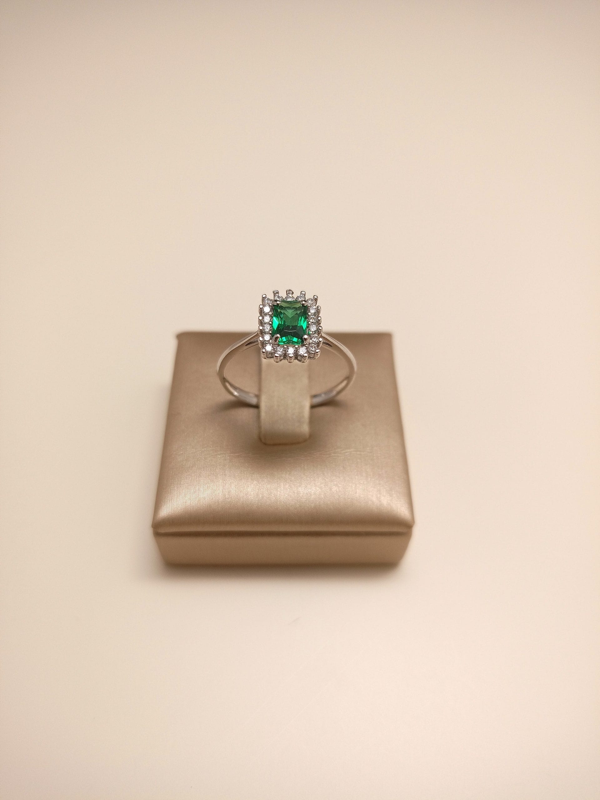 Anello Pietra Verde Da Donna In Oro Bianco 18Kt modello Kate con zirconi incastonati su gambo pieno. Peso dell’anello gr 1.70