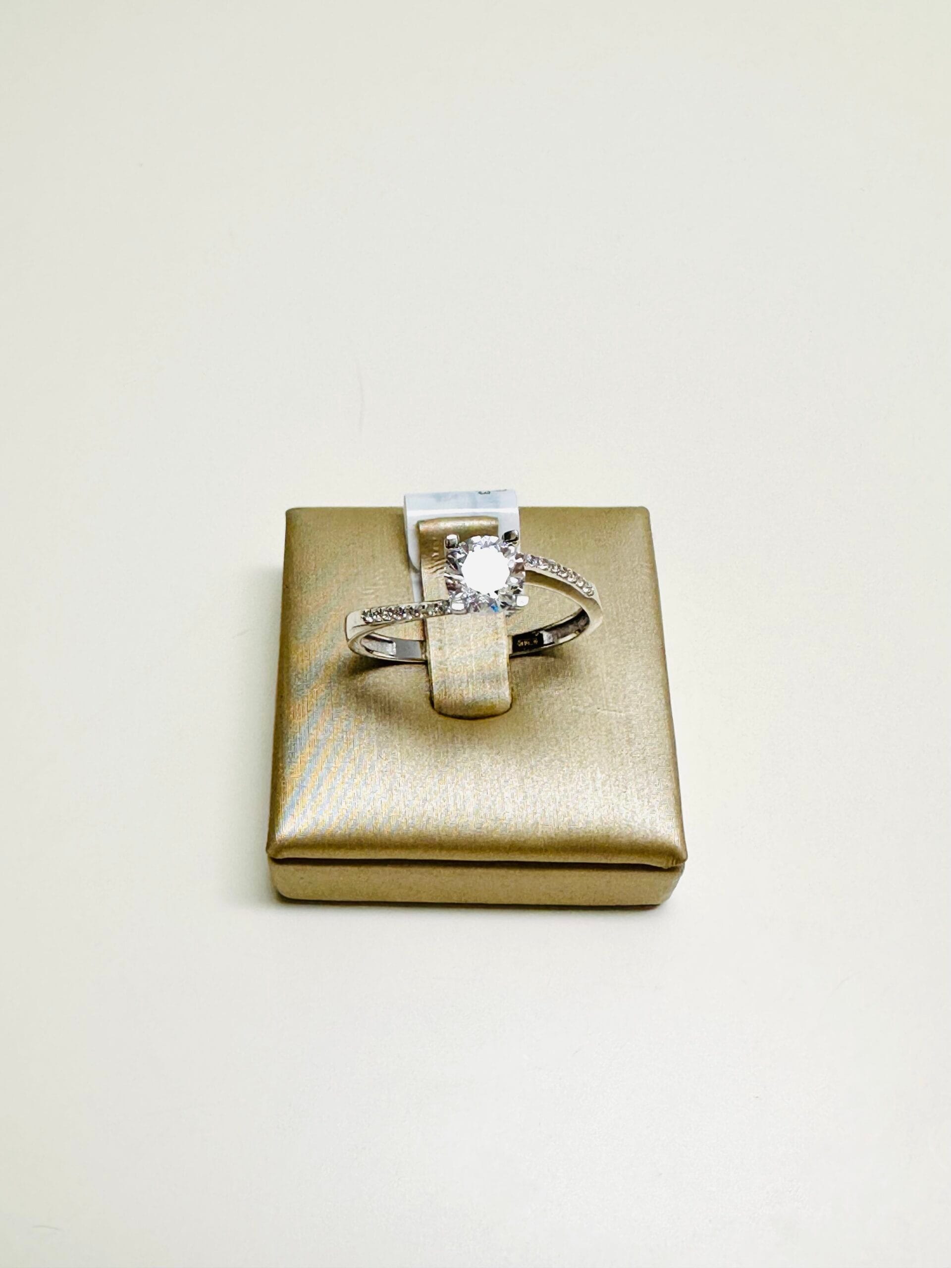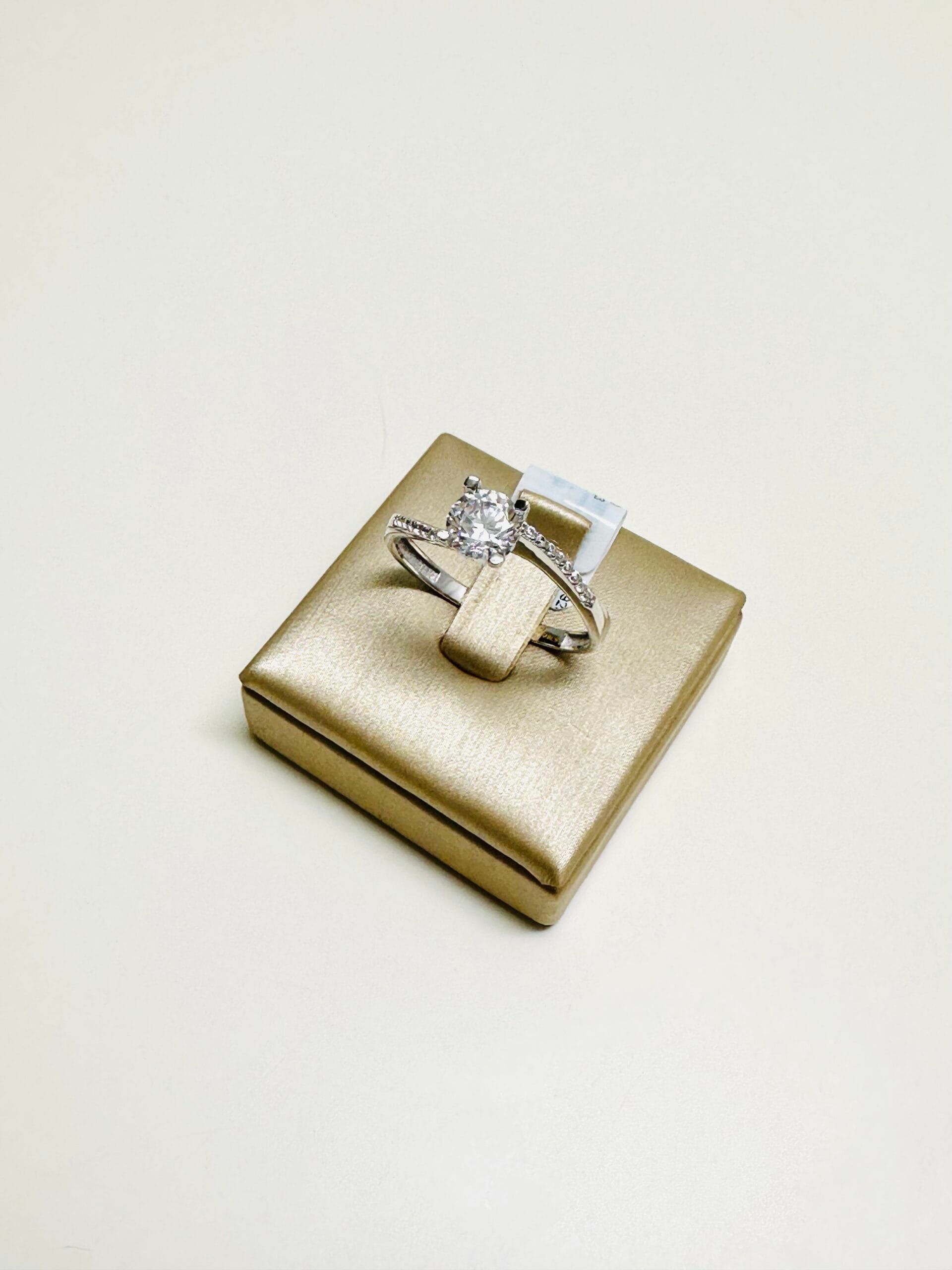 Anello Solitario In Oro Bianco 18Kt con zirconi incastonati su gambo pieno. Peso dell’anello gr 2.3