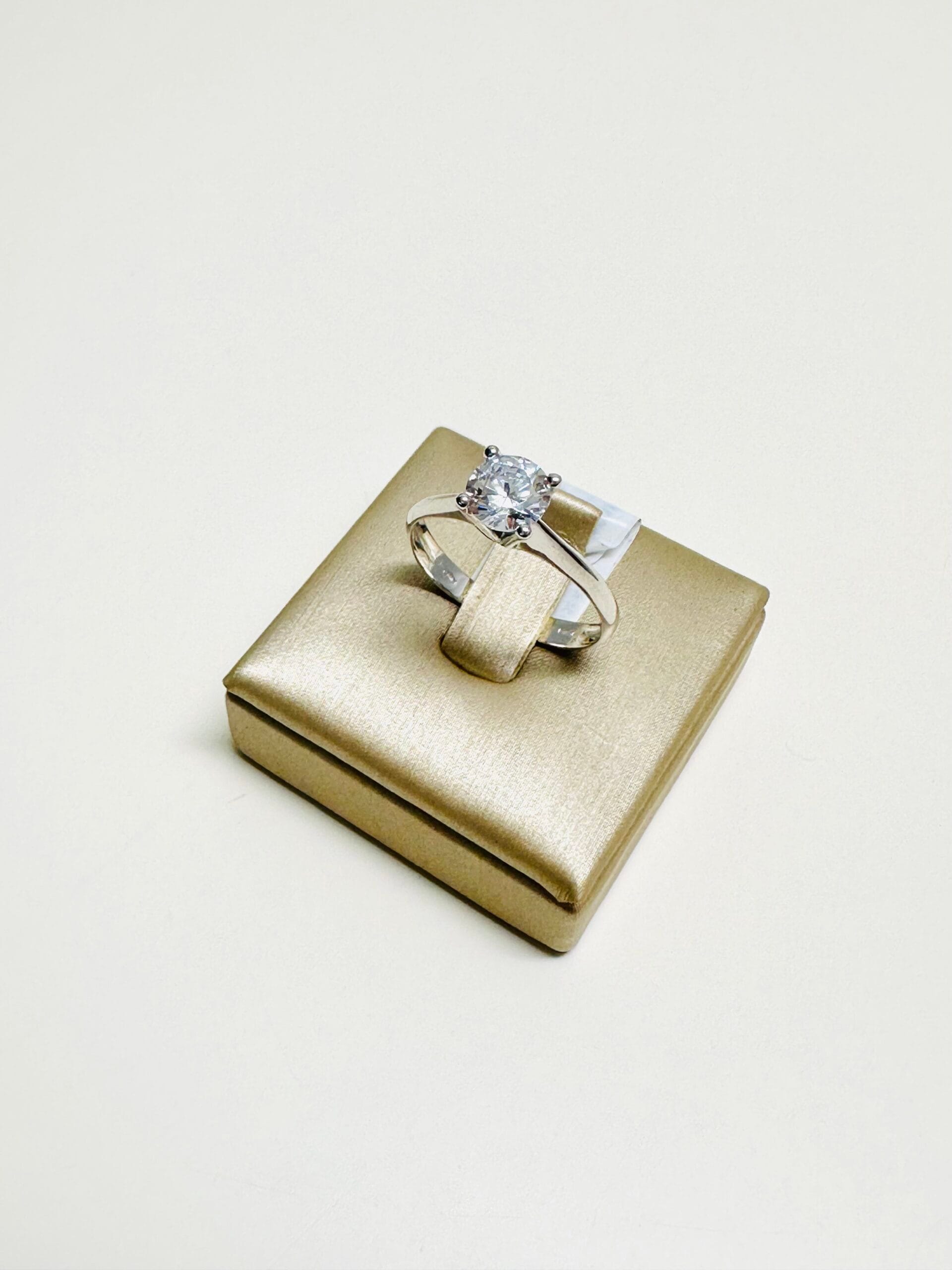 Anello Solitario In Oro Bianco 18Kt con zirconi incastonati su gambo pieno. Peso dell’anello gr 2.3