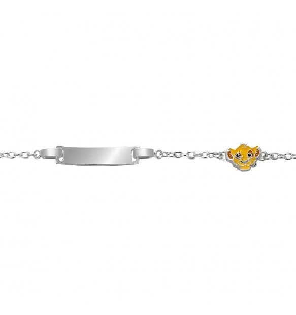 Braccialetto da bambina realizzato in argento 925%. Targa centrale incidibile ed elemento laterale a forma di Simba con smalto.