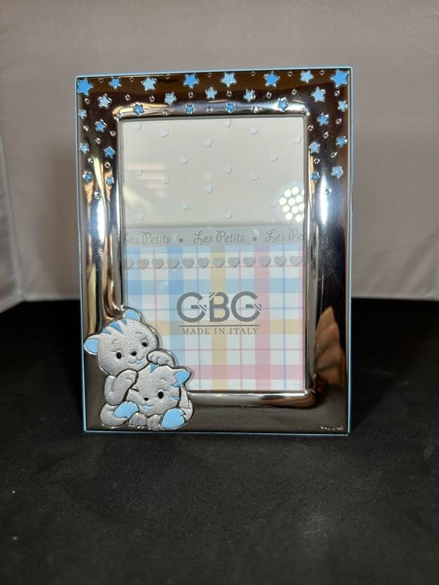 Cornice in argento GBG celeste con due gattini e stelline celesti smaltate che misura 12×16 cm