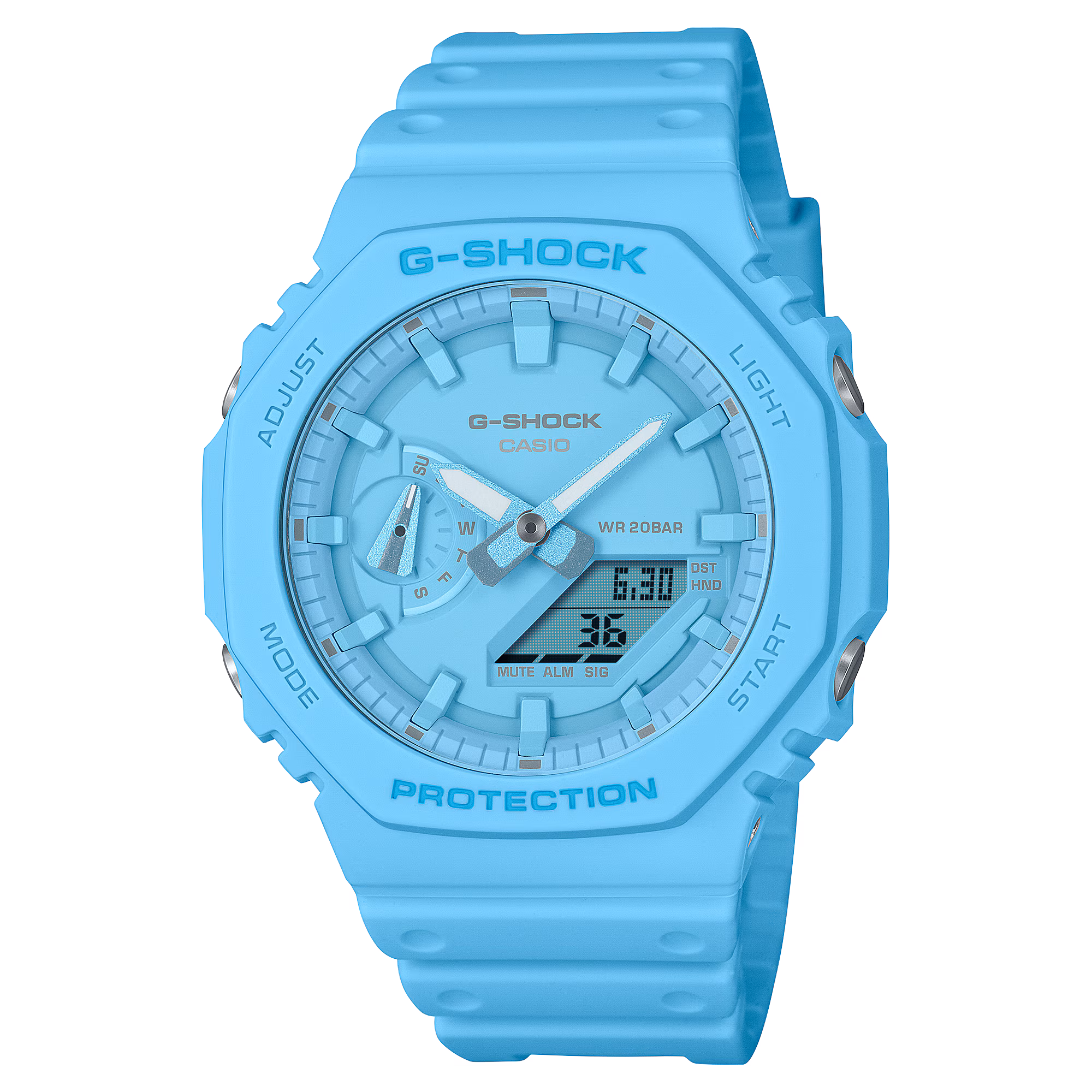 Dai il benvenuto alla serie G-SHOCK Tone-on-tone dallo stile monocromo con colori vivaci e brillanti. Il modello GA-2100 con la cassa ottagonale è reinterpretato in un design monocromatico disponibile in tre colori di tendenza: azzurro, bianco e lime. I dettagli del quadrante sono rifiniti con sfumature leggermente diverse dal colore dell’orologio per un look tono su tono che vanta profondità e dimensioni sorprendenti. I componenti principali dell’orologio sono realizzati in resina bio-based prodotta utilizzando risorse biologiche rinnovabili per contribuire a ridurre l’impatto ambientale. Questi orologi colorati sono l’accessorio perfetto per i look più alla moda.
